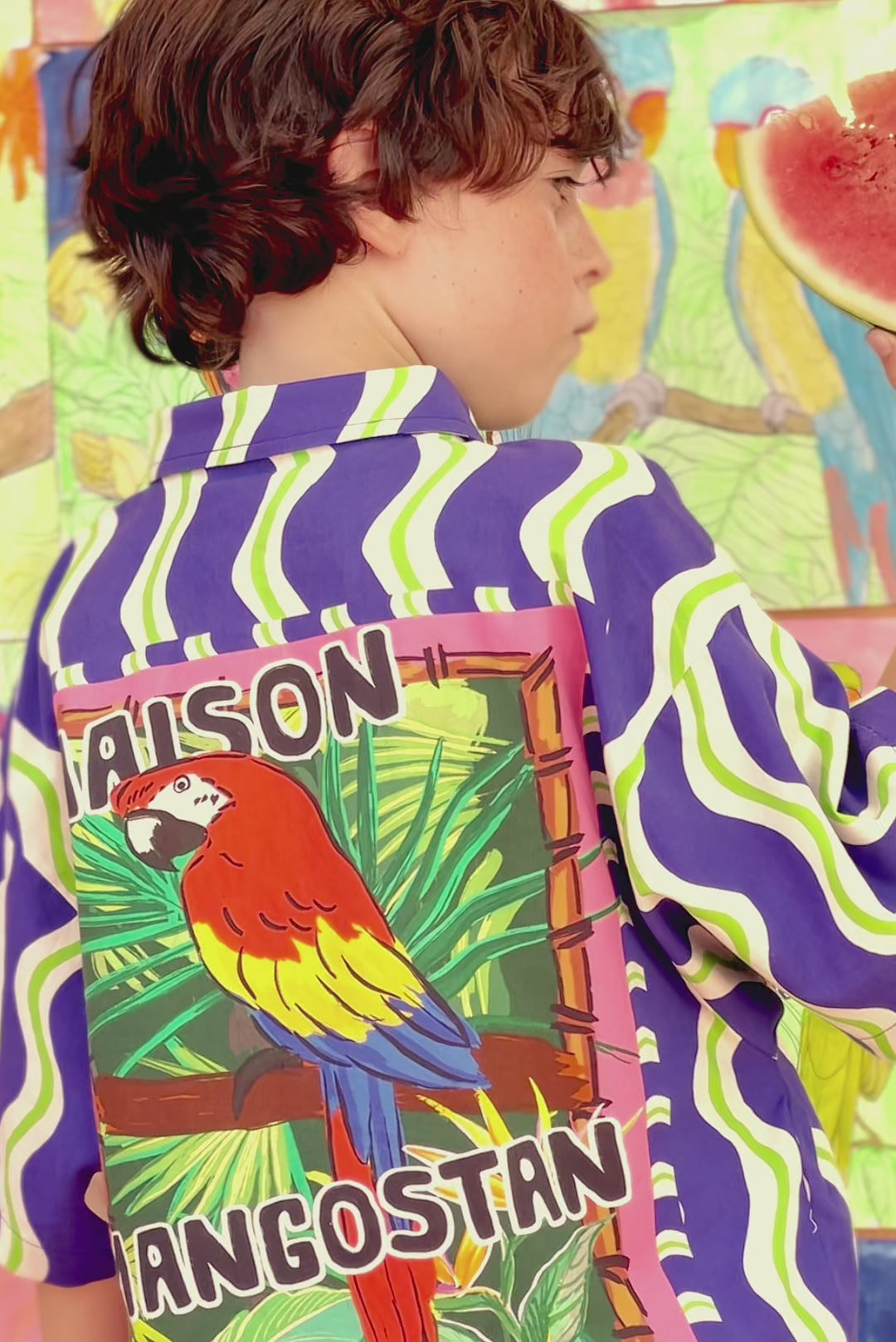 The Loros Wavy Shirt in blue has an oversized fit, and features a wavy all-over print and Loro placement print on the chest. It has short sleeves, lapel collar, and corozo button-up closure.
